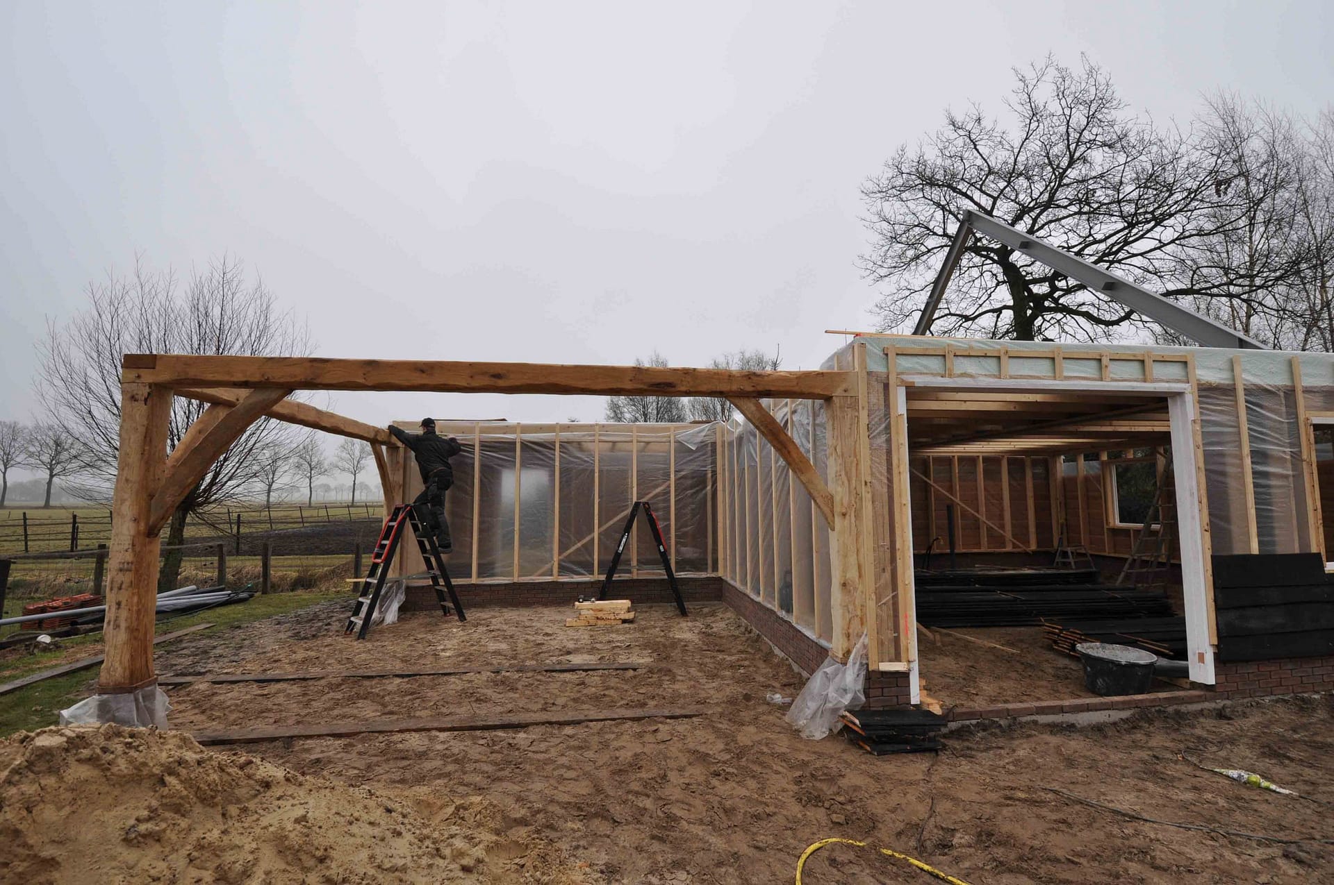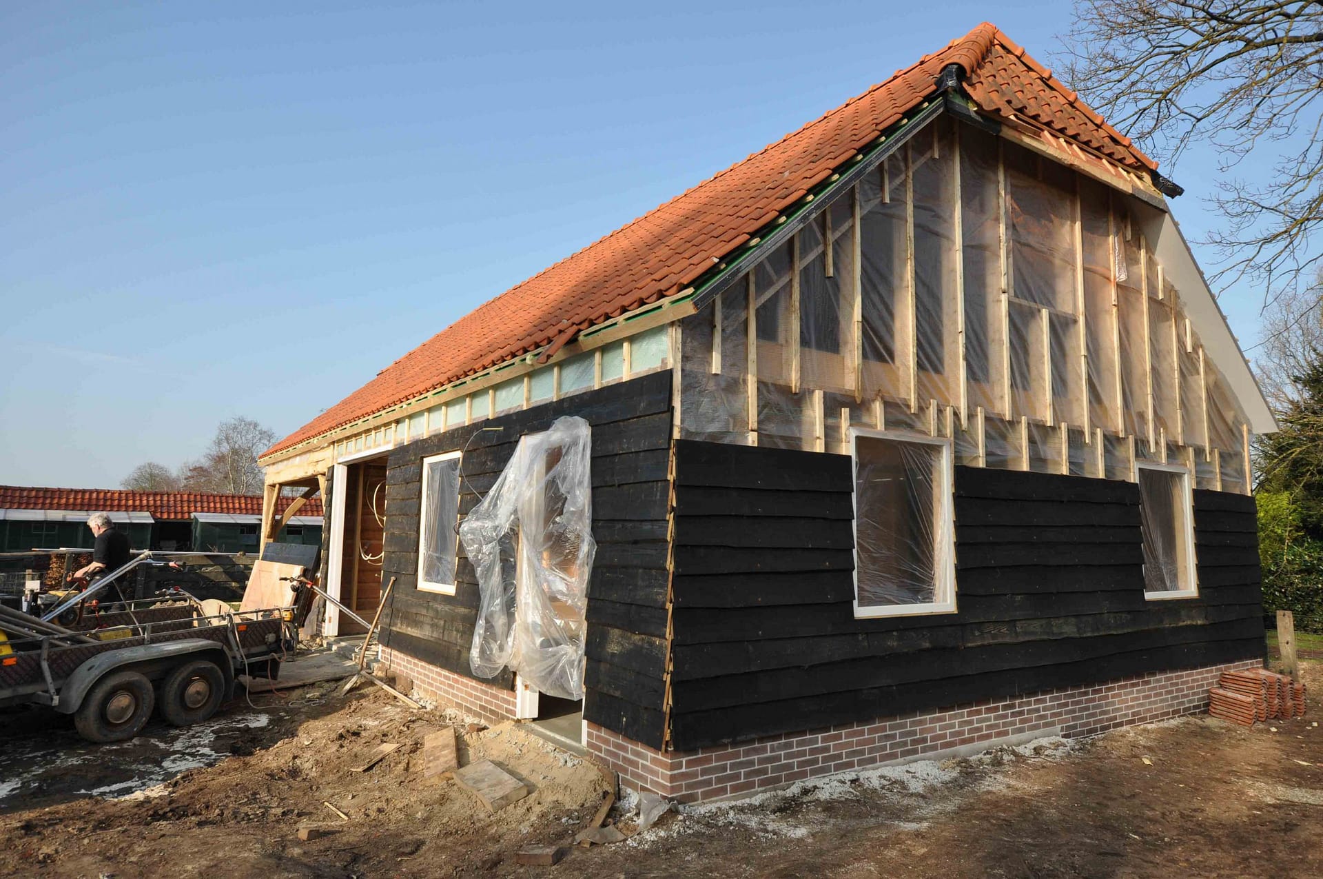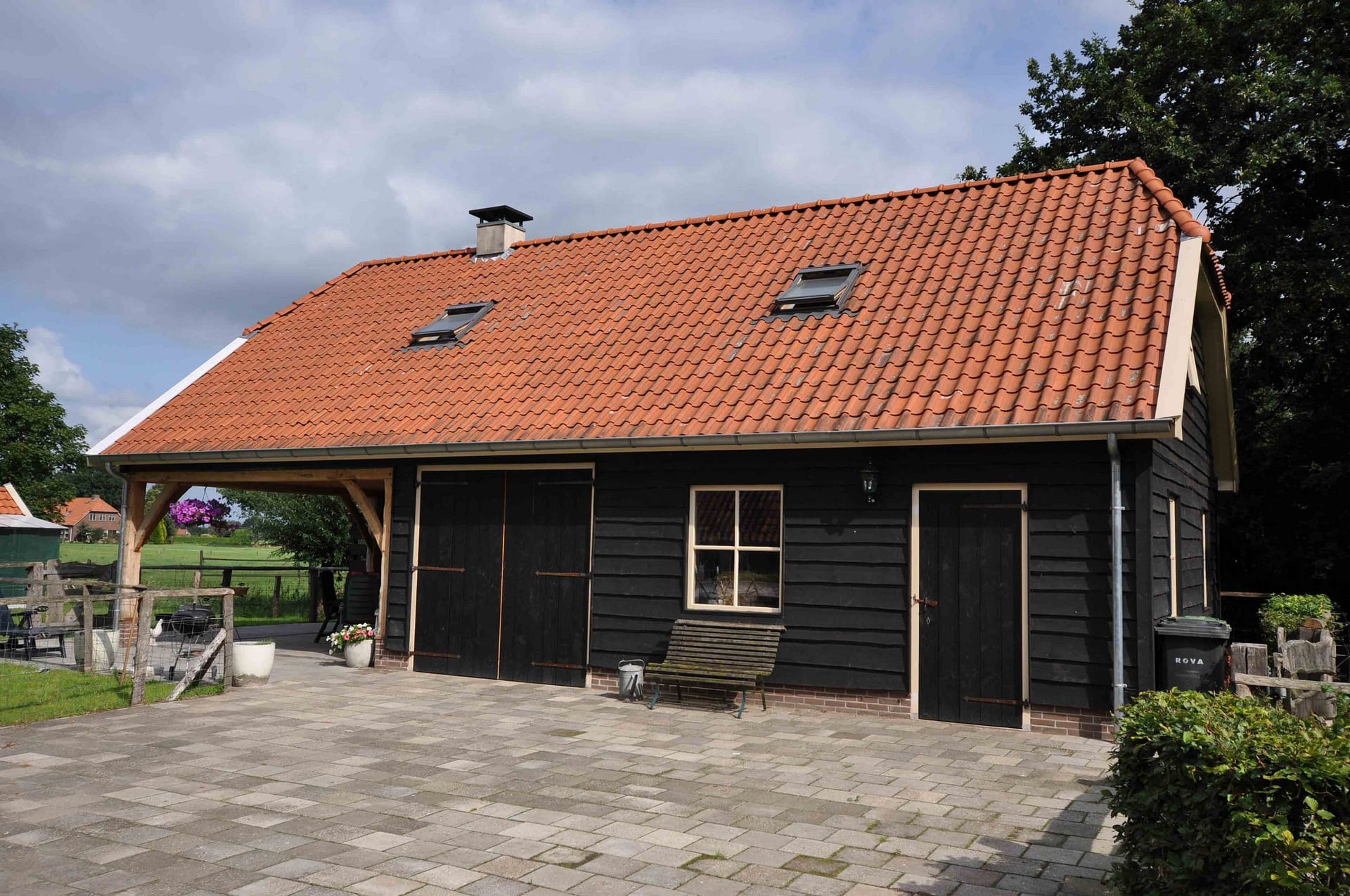 Een vrij grote schuur met zwart geteerde planken en overdekt terras. Het buitengebint is gemaakt van eiken. De schuur is gedeeltelijk dicht, een gedeelte wordt gebruikt voor autogarage en de rest als opslag. Op het dak gebruikte gebakken dakpannen.
