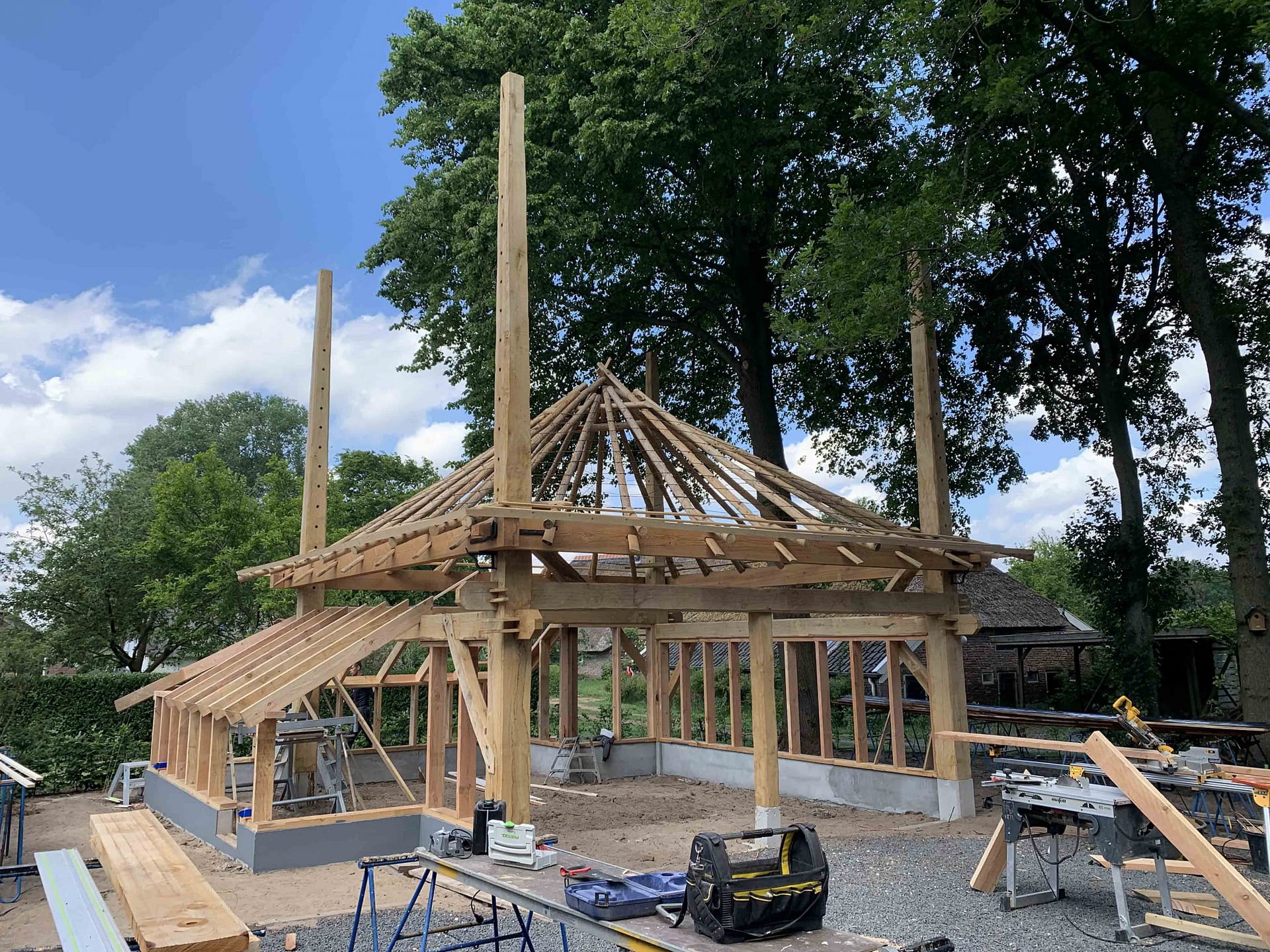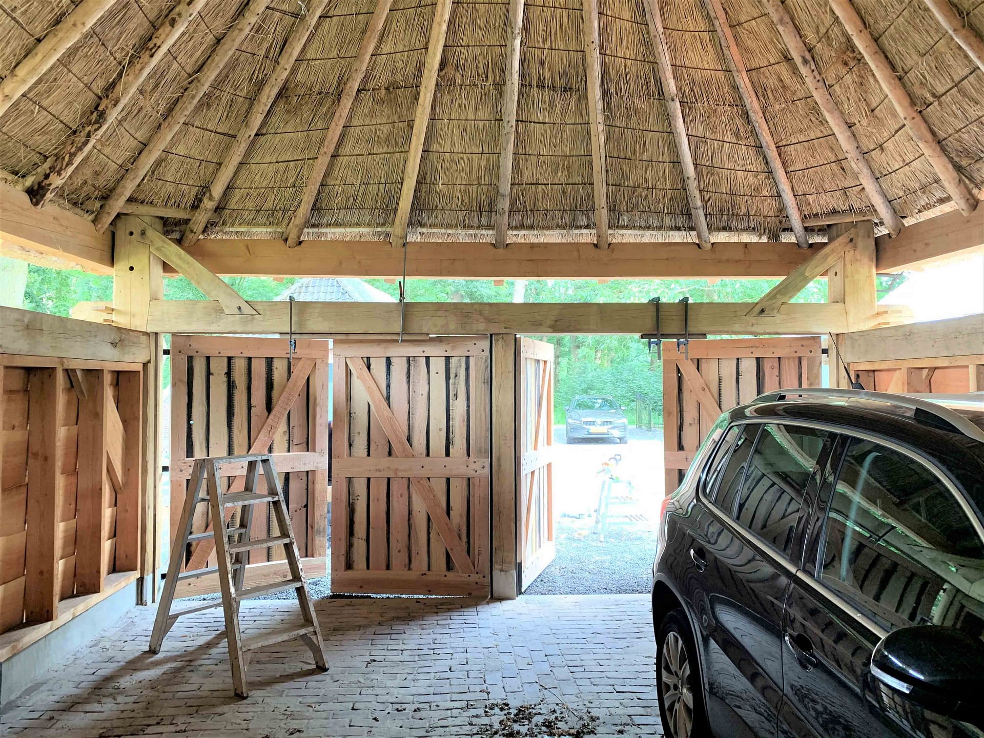 Vier-roedige schuurberg. Basis is een hooiberg van 6x6meter die aan twee zijden is uitgebouwd. De basis hooiberg doet dienst als garage, de uitbouwen worden gebruikt voor opslag.